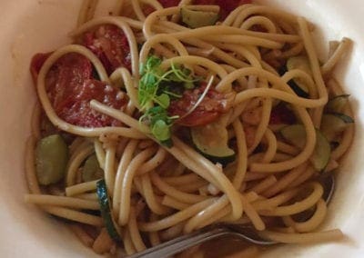 Fresh mushrooms, olives, spinach, tomatoes and basin in your choice of light marinara of Rose sauce